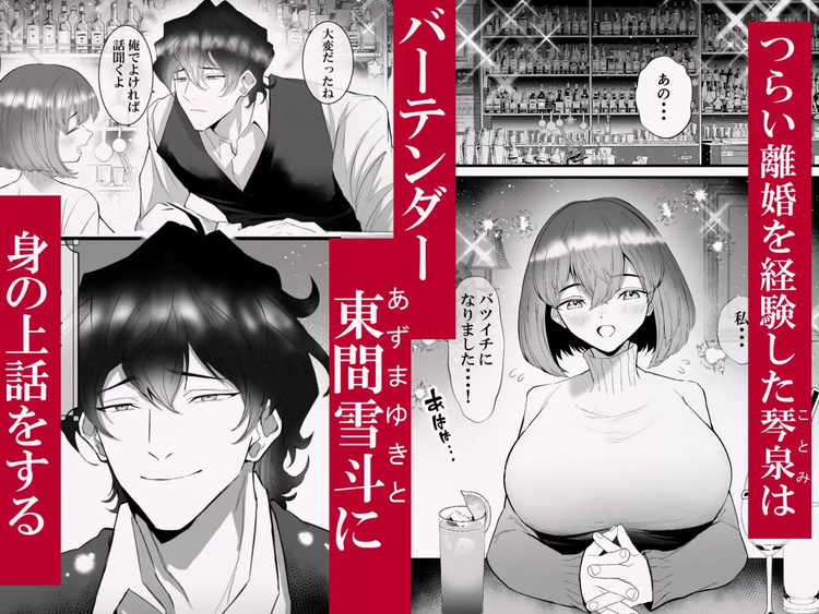結婚生活で傷つけられてバツイチになった琴泉。行きつけのバーの店長さんに身の上話をしているうちに涙がポロリ。巨乳バツイチ女の隙だらけの心を見逃さず、お持ち帰りして巨根で癒す大人のティーンズラブ。親身になって話を聞いてくれるバーテンダーというだけで心を許してしまいそうになりますね。元夫に傷つけられた心と身体を中からたっぷりと癒してくれる最高に激しい巨根セックスが描かれています。淫語まみれの言葉責めと執拗なクリ責め、子宮にまで届く大きな巨根によって琴泉の理性は崩壊。元夫では体験できなかった快楽に溺れている最中に店長からまさかのプロポーズ。マッチョな巨根バーテンダーに全てを鷲掴みにされてしまうTL漫画です。