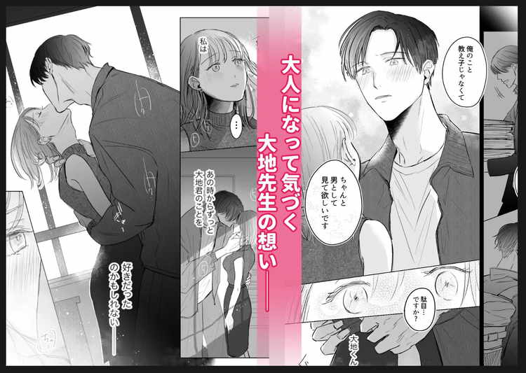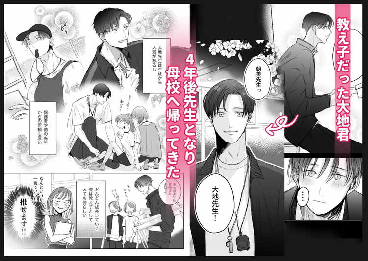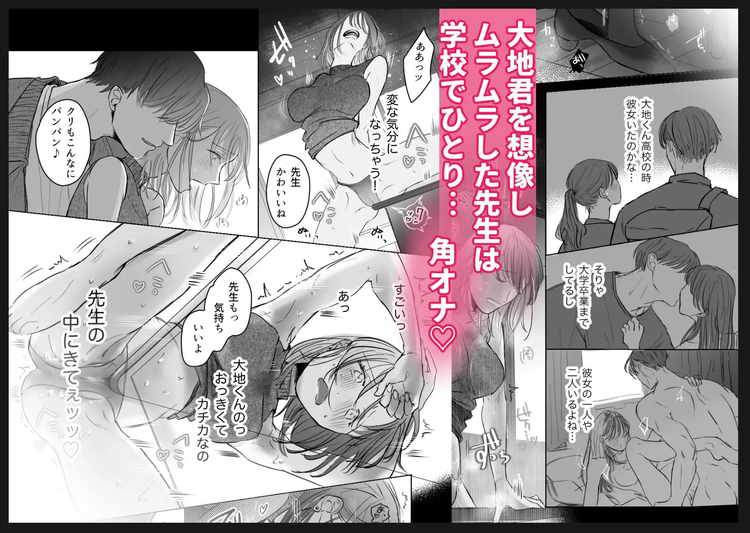 教師と生徒の関係だった男女が教師と教師の関係になって学校でセックスする職場TL漫画。生徒だった大地君が担任の朝美先生に告白するもあえなく玉砕。それから4年後、大地君が体育の先生になって朝美先生がいる母校に帰って来た。先輩後輩という関係になった二人が、とある出来事をきっかけに大人の男女として交わる時が来ました。立派な先生に成長した大地君を想いながら学校の教室でオナニーする朝美先生。おとなしくて真面目そうな女性教師ですが、なかなかにエロい人でした。その現場に遭遇してしまった大地君。大好きな憧れの先生のオナニーを目撃してしまったら理性を保つことは難しいでしょう。そして二人は誰もいない夜の学校で一晩中セックス。教師とは思えないほどの濃厚な前戯と激しいセックスで想いをぶつける大地君でした。清純そうな顔をして二人ともかなりエロいです。