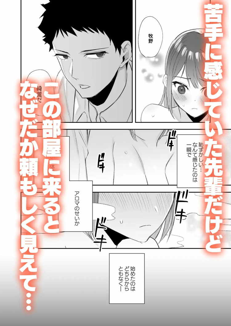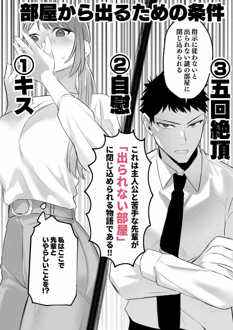 残業中の社員が突如現れた謎の部屋に閉じ込められて出られなくなるという噂が会社で広がっていた。本作は、その部屋と遭遇してしまった先輩後輩の男女が主人公。鉄仮面先輩・杜沢敬一、真面目な後輩・牧野由依の二人がこの部屋から脱出するために強いられた指示は「キス」「オナニー」「5回絶頂」だった。常に無表情で怒っているようにも見える苦手な先輩を相手に後輩牧野は上手く対応できるのかと不安になりますが、先輩だけが知っている秘密があった。実は以前にも二人はこの部屋を訪れていた。先輩は覚えていて後輩はその時の記憶を失くしているという状況。そして、先輩は後輩牧野の感じるポイントを知り尽くしていた。苦手な先輩とセックスしないと出られない部屋に閉じ込められる人気設定TL漫画。本当に無表情の鉄仮面先輩の意外な純情が高評価。