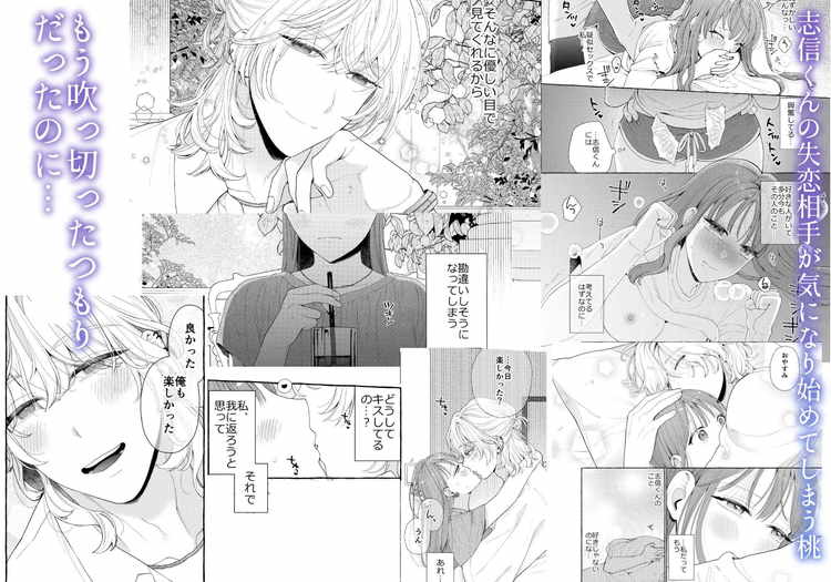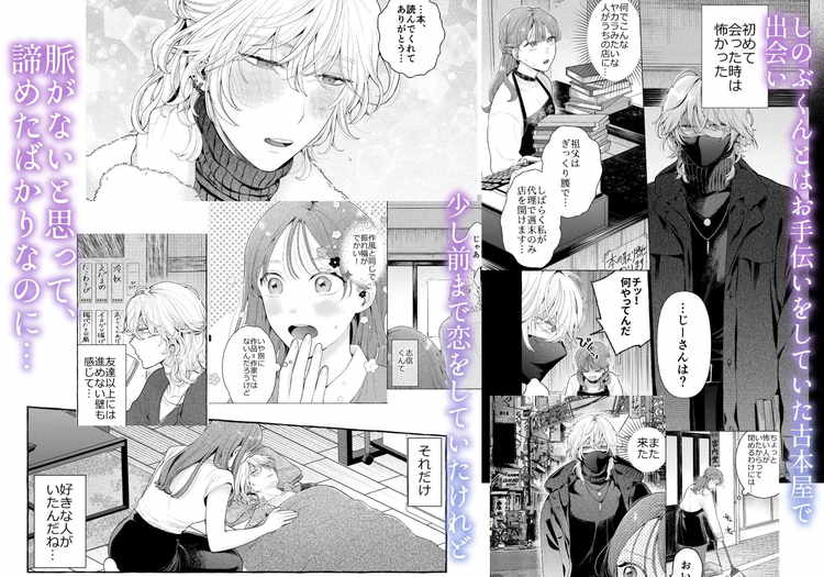 見た目は怖いけど中身は優しい小説家・月島志信と知り合い、二人で飲みに行くほどの仲になった書店店員・宮内桃。志信に恋心を抱いていた桃でしたが、友達以上の関係にはなれない壁を感じ諦めつつあった。しかしある日、志信から「勃たなくて振られた」という深刻な悩みを打ち明けられる。酔っ払うと話を聞かない志信から「疑似恋人になってイチャイチャする経験が必要」というの半ば無理矢理な提案を聞き入れる桃。期間限定でイチャイチャするだけの関係なんて都合の良いものになるはずがなく本気のイチャラブエッチに突入してしまう純愛初エッチTL漫画。ミステリアスな容姿をした志信くんですが酔っ払うとめちゃ可愛い。擬似恋人から本気の恋に発展する両片思い男女のセックスが高評価。シックスナインでフェラチオとクンニをしている二人の姿は必見。