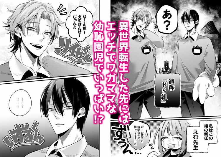 異世界にはヤンチャでエッチな高身長園児が集まる幼恥園という施設が存在した。主人公はそこで働くことになった新任・えむ先生。本作は、見た目はイケメンだけど中身は園児のリイトくんといずるくんから好き好き攻めでグチャトロにされるストーリー。ヤンキー系のわんぱく男子リイトくんは真っすぐな愛情表現をしてくる素直な子。いずるくんは無表情でクールだけど先生想いの優しい男の子。そんな二人に気に入られたえむ先生の身体は毎日のように弄ばれる。いきなりおっぱいを求めてきては乳首に吸い付きクンニまでしてくるリイトくん。えむ先生に大好きなヒーローのコスプレ(ドエロ)をさせて性感帯を弄りだすいずるくん。大好きなえむ先生の身体を二人で仲良く気持ち良くするティーンズラブ。