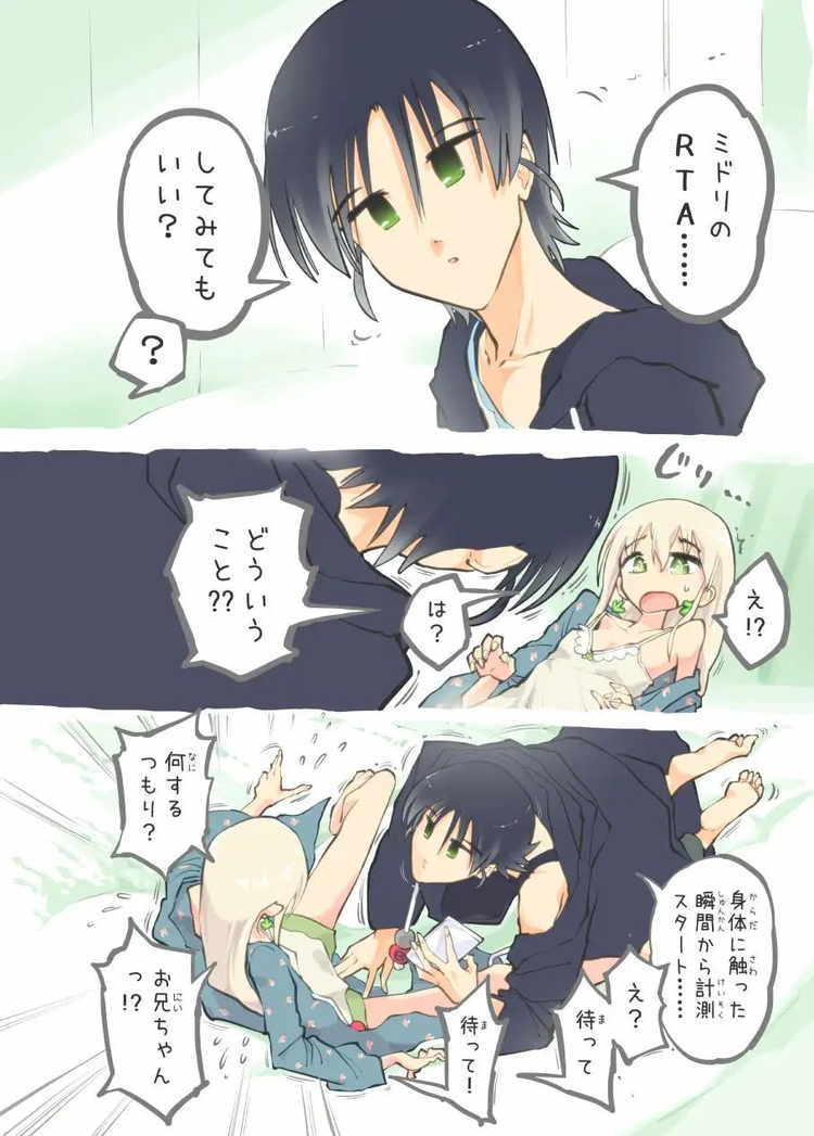 巧みな指捌きでコントローラーを操作する兄・リョクは世界トップクラスの天才プロゲーマー。妹のミドリもゲーム好きだがお兄ちゃんとまったり遊びたいエンジョイ勢。今日も兄妹仲良くゲームを楽しんでいると兄から「ミドリのRTAしてみてもいい?」という謎の問いかけが。「どういうこと?」ミドリの返事を聞く事もなく、リョクが触れたのは女の子の敏感な性感帯・クリトリス。なんと絶頂リアルタイムアタックをしようというのだ。抵抗しようにも、止まらないプロゲーマーの目にも見えないクリ責め連射。その圧巻の指使いに妹は手マンをされるがまま。プロゲーマーの手マンでイカされる可愛い妹のTL漫画。常に真顔で無表情のお兄ちゃんから狂気を感じます。