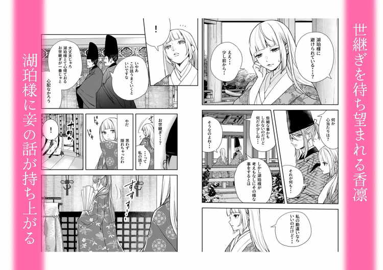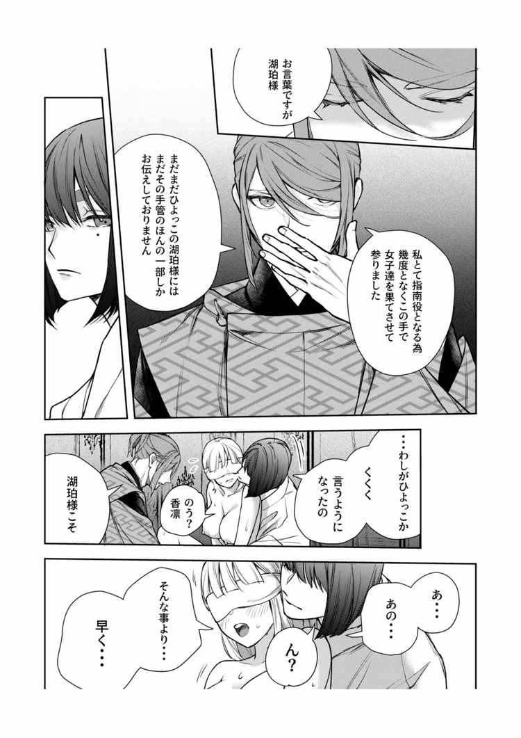 「朝霧〜桜の道の見届け人〜」の続編。幼いころからの許嫁である若き帝・湖珀様と、大好きな幼馴染・朝霧。朝霧への想いを諦めて湖珀様に嫁いだ香凛でしたが、迎えた初夜で指南役として傍にいたのは朝霧だった。想いを寄せる男性に見守られながらの夜の営みで夫と交わった前回から一年。今回は香凛に対する湖珀様の想いをメインに描かれています。可愛い妻が想いを寄せる幼馴染にクンニされるさまを見守り、二人のキスを見て心を痛める湖珀様。溺愛と嫉妬が渦巻く絡みだけでなく、寝取られ要素でさらに性を高める三人。湖珀様の帝らしい器の大きさと、美しい絡みが高評価。エロさはもちろん、絵がめっちゃ綺麗で上手い人気TL漫画です。