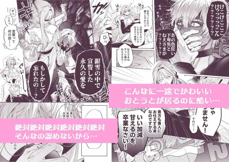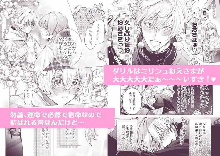 幼少期のころから凄まじい魔力を持っていた男の子・ダリル。ある日、村ごと凍らせてしまい捨てられていた彼を拾ったのは真面目で優しい女の子・ミリシュ。ダリルを家族として迎え入れ、本当の姉弟のように育ってきた二人も今や立派な大人。しかし、ダリルの異常なシスコンぶりに頭を悩ませるミリシュ。わずか半月ほど会えなかっただけなのに、再会した時は涙を流してすり寄ってくる可愛い弟的存在。ですが、このままではいけないと考えるミリシュはダリルに「幼馴染と結婚する」と嘘をついて姉離れさせる作戦を決行。話を聞いた途端に顔色を変え、身体を震わせながら大反対するダリル。「そんなの認めない。姉様は俺の女。」オスに豹変したダリルの暴走は止められない。強引なキスと愛撫によって身体の自由を奪われ、弟的存在のヤンデレ泣き虫男子にわからされる義理姉弟ティーンズラブ。義理姉への異常な執着心と独占欲が性欲となって快楽を叩きつけるエロシーンが見どころ。