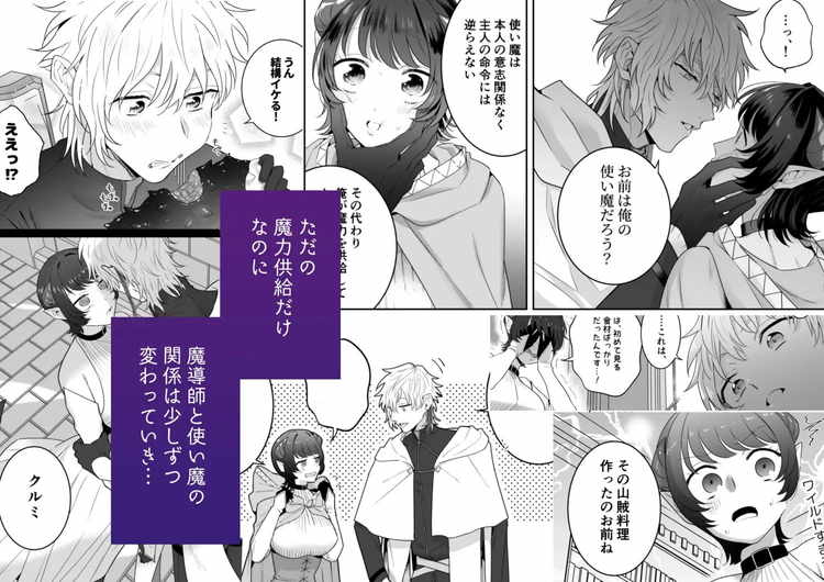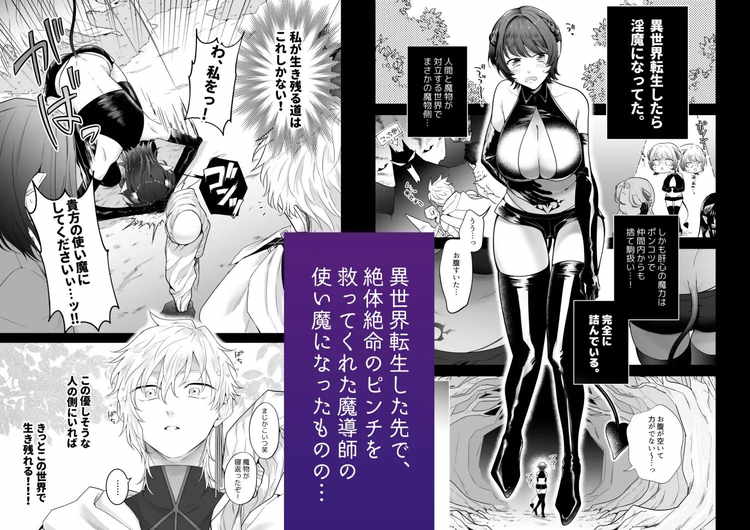 普通のOLだったクルミは突然の異世界転移で淫魔に変身。周りを見ると人間と魔物の壮絶な戦いが起こる世界だった。おまけに自分はクソ雑魚淫魔。このまま人間にヤラれるのかと諦めそうになった時、救ってくれたのは優しい魔導士ラムルだった。ラムルの穏やかな立ち振る舞いを見て「この人についてゆけば生き残れる」と確信したクルミはその場で使い魔に立候補。その驚きの行動にあっけにとられるラムルでしたが、クルミを使い魔にする事に。しかし、ラムルの本性は使い魔には容赦のないドS。至る所で魔力供給と称してエッチなプレイを強いられるクルミ。抵抗して逃げ出したいけど、使い魔としての使命と淫魔の本能によって受け入れるしか選択肢はない。ドS魔導士と転生淫魔が淫らな主従関係から愛らしきものが芽生え始めるファンタジーTL漫画。