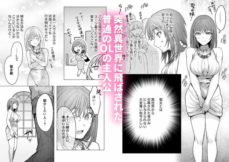 ある日突然異世界に飛ばされたOL・くれあは、その世界で魔王討伐を目指す聖女として生きることに。旅の従者として紹介されたのは騎士団長・イエル。キラキラと輝く美男子というだけでなく、良い人オーラも溢れる真面目な騎士。彼と二人で旅に出るわけですが、さっそくスライムと遭遇。騎士団長のお手並み拝見という展開でしたが二人はスライムの触手によってガッチリ拘束されてしまう。身動きが取れないまま服を溶かされ、二人まとめておっぱいもお尻も恥部も露わに。聖女の乳首に吸い付き、騎士のアナルと肉棒にまとわりつく触手。ウネウネと動くスライムの触手に執拗に性感帯を攻められる二人。出会ったばかりの男女がスライムに捕らわれてエッチなプレイを強いられるファンタジーTL漫画。男女まとめてエロい目に遭うストーリーが高評価。