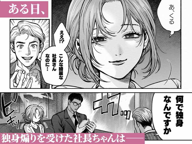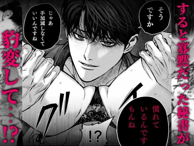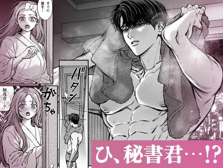美人だけど独身の女社長が真面目な眼鏡秘書に堕とされるオフィスラブTL漫画。「こんなに綺麗なのにどうして独身なんですか?」聞き飽きるほど聞いてきたこのセリフについにブチギレしてしまい「秘書に毎晩抱かれています」というとんでもないデタラメを発してしまった女社長。たちまちその噂は社内から身内にまで広まり、二人はカップルを演じるはめに。用意されたホテルに宿泊する事になった女社長と秘書の加茂くん。そこで偶然風呂上がりの加茂くんと遭遇した社長は彼の姿にびっくり。いつも眼鏡で仏頂面の秘書が前髪を降ろしたイケメンと化し、ムキムキマッチョの肉体をさらけ出していた。そこで女社長のメスのスイッチが入ってしまい二人は心身ともに急接近。処女を隠すために嘘をついた社長に、寡黙秘書の怒涛の言葉責めと巨根攻めが襲い掛かる。初めて味わうエッチの気持ち良さに潮を吹きながら何度も絶頂し、部下の前ではしたない姿を晒してしまう女社長。濃厚な愛撫で湿った肉体に玩具のように扱われる乱暴な突き上げ。昼は物静かな大きな部下にヨシヨシされて堕とされるオフィスラブTL漫画です。エロセクシーな筋肉と迫力のある体格差セックスシーンも必見。