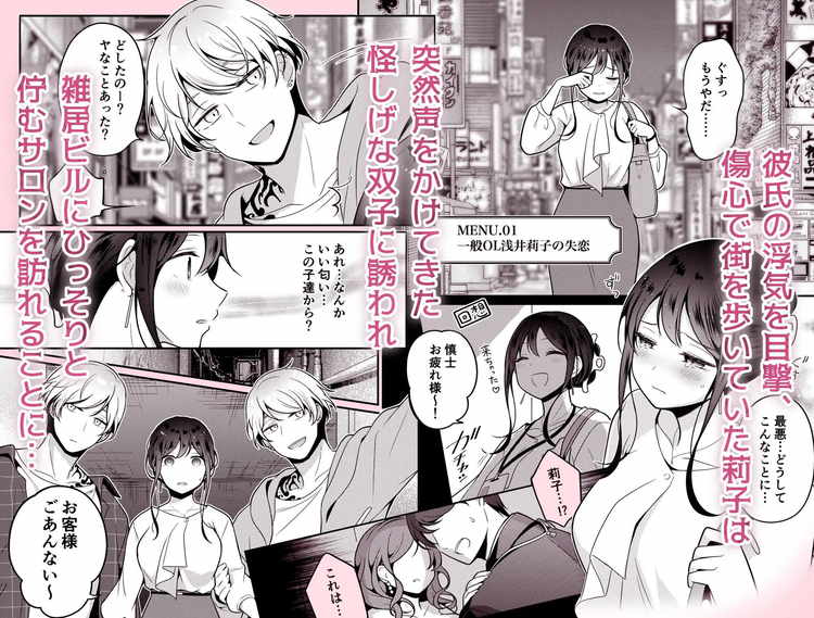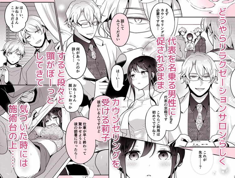 結婚まで考えていた彼氏に浮気されて街中を彷徨っていた傷心中のOL・莉子。そんな彼女の前に現れたのはいい香りがする双子の青年。いいお店を紹介するよという双子の押しに流されるがままとあるサロンに連れ込まれてしまう。店の奥から登場したのは素敵な眼鏡の先生・京極。Salon de Cthulhuは究極のデトックスサロンを提供するお店とのこと。カウンセリングで彼氏に浮気された事を話しているうちに不思議な気分になり、先生におすすめされるがまま施術を任せる莉子。力が入らず抵抗する事もできないまま先生から生えた触手で全身をくまなく愛撫されてゆく。止まらない触手の動きによって溜め込んでいた黒い感情があふれるとともに押し寄せる快楽。膣と肛門に侵入してくる触手に攻められるがまま二穴を暴かれてゆくマッサージTL漫画。先生のバキバキに勃起した巨根に堕ちてゆく傷心OLでした。