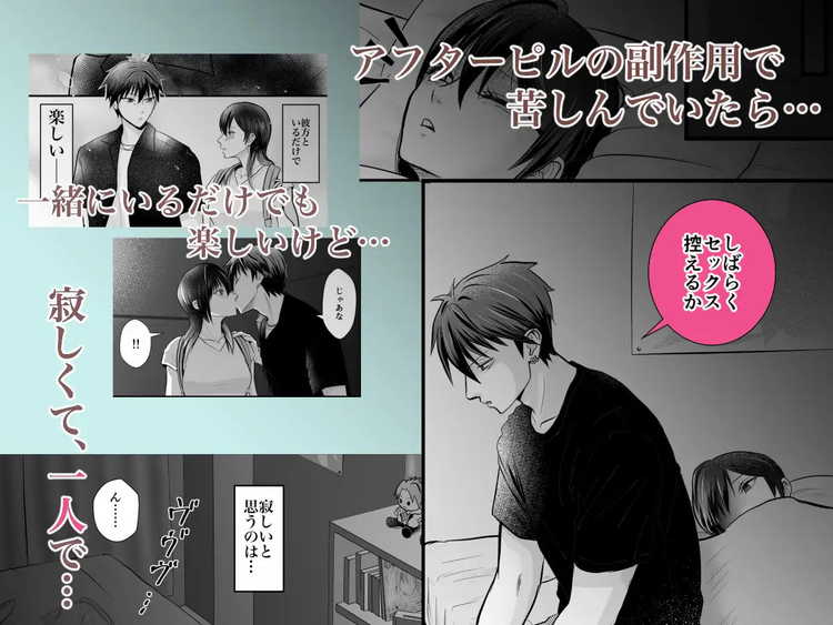 初めてのゴムなし生挿入を体験して、その気持ちよさにハマり中出しセックスを繰り返してしまうラブラブカップルを描いたTL漫画。趣味のコスプレで関係を深め合いながら両片思いを経て恋人になった伊緒と彼方。付き合って三か月の二人ですからそりゃもうヤリまくり。しかし、そんな中でコンドームが破れて避妊を失敗してしまう事態に。そこでアフターピルを処方してもらったものの副作用で苦しむ伊緒。その姿を見てセックスするのを控えることにした彼方。優しいです。無事に生理は訪れたものの、今度は生理痛に悩まされることになる伊緒。痛みを和らげるためにピルを服用することを選んだわけですが、そこから二人は久しぶりのセックスで燃え上がるストーリー。初めて体験する生挿入の気持ちよさと、膣内射精の快感にどっぷりとハマり中出しセックスを繰り返す。付き合って数か月目のラブラブ期間中ですからヤリまくりです。背面座位や立ちバックに駅弁など、さまざまな体位で生の合体を楽しんでいます。