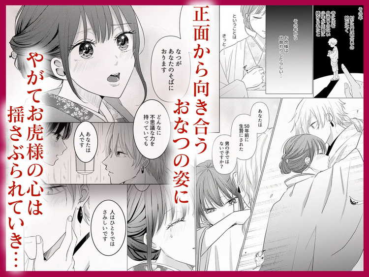 「百日以内に神の子を宿せ」というお告げのため、山の神・お虎様に嫁ぐことになった村娘・おなつ。「嫁ぐ」とは言うが生贄のようなものと思われていた。務めを果たすために儀式を行い、お虎様が現れる本殿の中へ通される。人ではないものの子を孕まなければいけない不安と緊張の中、姿を現したのは大きな虎の姿をした神様だった。しかし、その虎は青年へと姿を変えておなつのもとへ。処女であるおなつの体を優しく愛撫し、淡々と快楽を与えてくるお虎様。その表情はどこか寂しくわけありそうな雰囲気を醸し出していた。そんなお虎様を知るために、おなつは心を開いて彼との距離を縮めてゆく。神と人との子作り夫婦生活を描いたファンタジーTL漫画です。虎(猫科)らしい舌や性器のトゲトゲと獣耳、神の力による絶倫セックス、妻になった人間の娘を溺愛するお虎様の攻めが高評価。虎獣人のクンニは凄そうですね。