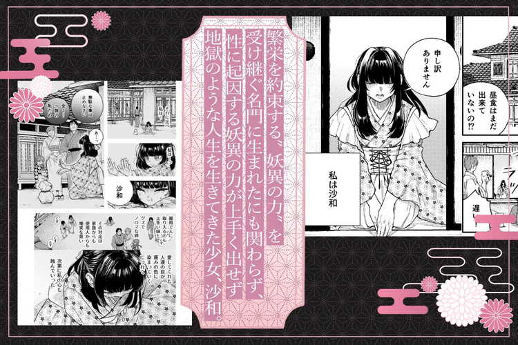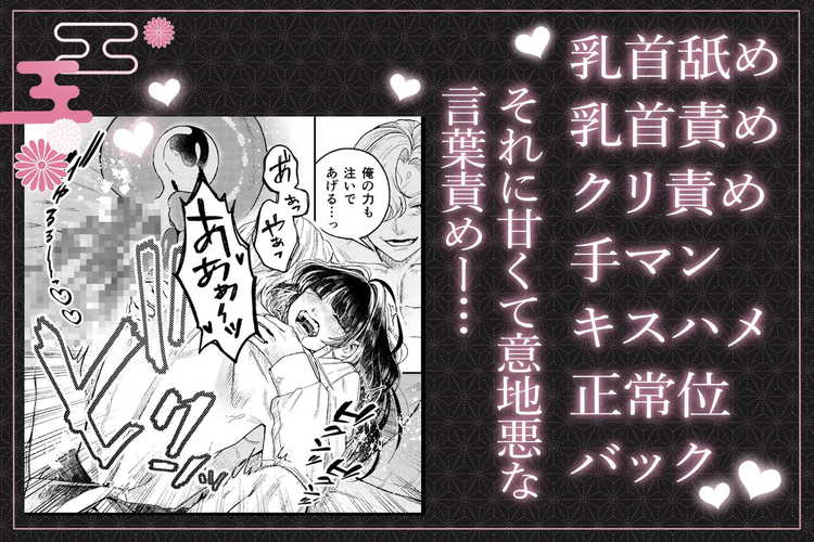 大正時代が舞台のファンタジーロマンスTL。「妖異の力」を操れる名門一族に生まれた沙和。しかし、彼女はその力を扱えず肩身の狭い思いをしながら暮らしていた。両親や妹から蔑まれ、酷い扱いを受けてきた沙和に結婚の話が舞い込む。お金と引き換えに、幼女趣味の大財閥の中年男に嫁がなくてはいけなくなった沙和は絶望する。その苦しみを、いつも優しく接してくれていた紫苑に打ち明ける。町内の女性からも人気のあり、誰に対しても分け隔てない彼は沙和を力強く抱きしめながら言う。「俺が救い出してやるから」紫苑の体からあふれる「妖異の力」を見て驚く沙和。地獄のような生活の中で唯一幸せを与えてくれていた素敵な男性と結ばれるストーリー。どこか裏がありそうだった紫苑の真剣な想いと、乳首舐めとクリ責めを多用する濃厚な前戯が高評価。そして、意地悪な言葉責めに辱められながらも感じてしまう沙和の健気受けが見どころ。念入りに乳首を攻められ、クリトリス攻め重視の手マンで幸せな快楽に堕とされるキスハメがエロい。