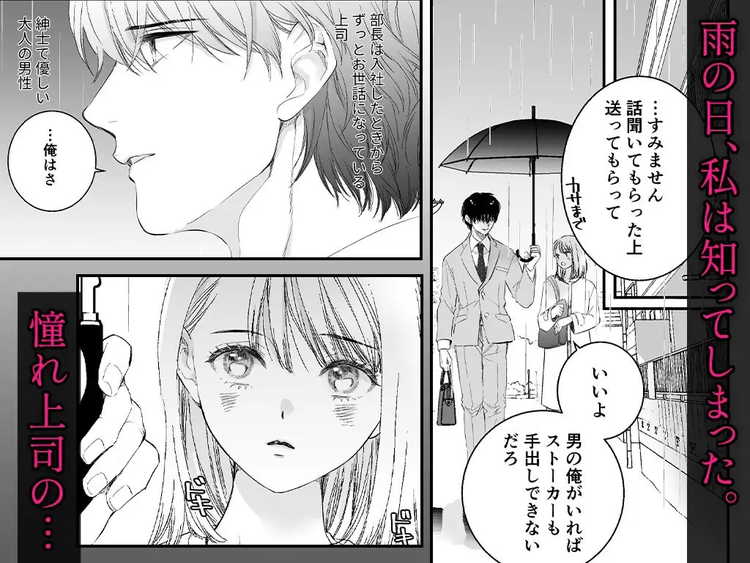 超人気TL漫画の第一章と第ニ章。入社した時から優しくて穏やかな上司・雨宮誠一は、主人公・小西陽菜の憧れの男性。社内の男女から人気のある雨宮に淡い恋心を抱いていた陽菜が、ある日ストーカー被害に遭ってしまう。怖くて自宅に帰れない陽菜を心配する雨宮はいつものように優しく彼女をサポートする。しかし、ストーカーの正体はその雨宮だった。狂愛とも言える重すぎる執着心と独占欲で子種を植え付けようとする第一章。愛する女性を監禁して全てを支配しようと目論む第二章。膣内射精することだけが目的の自己中心的なセックスではなく、キスや手マンやクンニを多用した濃厚愛撫でしっかり体を堕としにかかる執着攻めが高評価。大好きな陽菜を監禁し、お漏らしの処理も食事も着替えもテキパキこなす雨宮はやっぱりできる男。ストーカーじゃなければ完璧なスパダリです。愛と狂気にまみれながら快楽に堕とされてゆく陽菜が選んだ運命は。ヤンデレやサイコの重い愛をお楽しみください。
