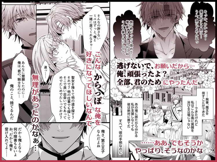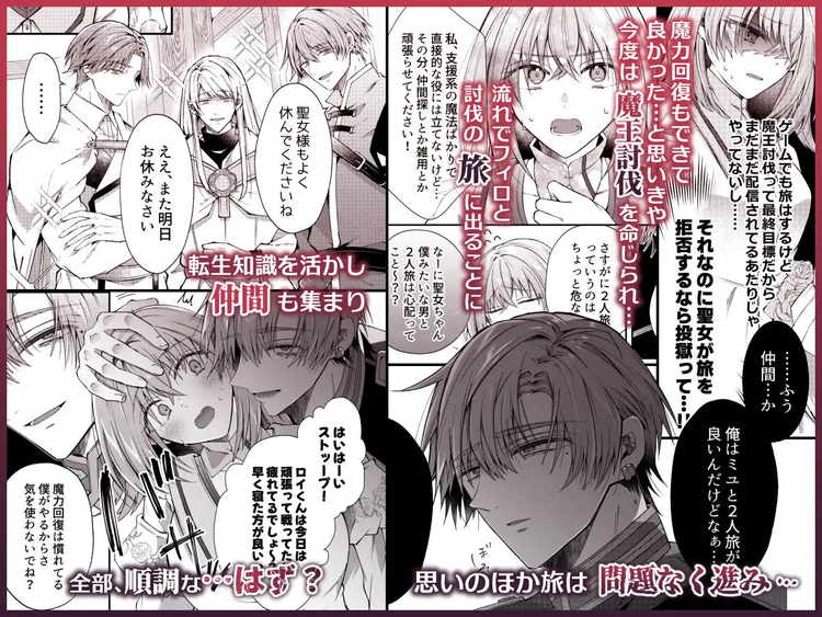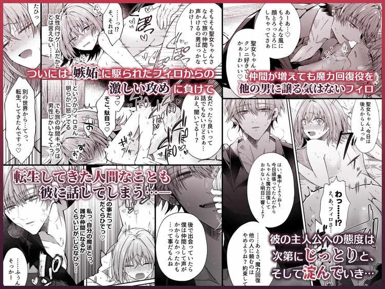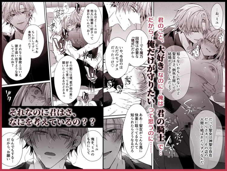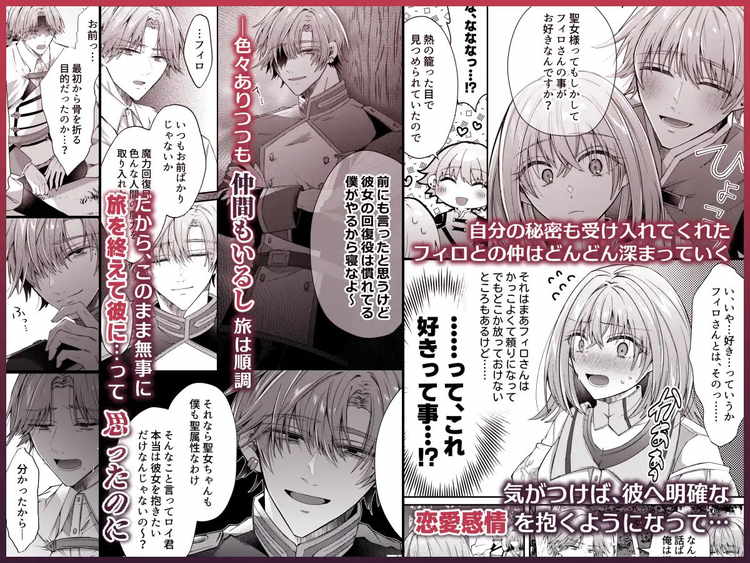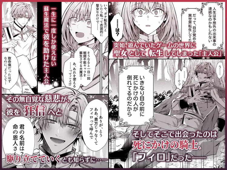 聖女に生まれ変わった異世界転生ヒロイン・ミユ。目覚めたらゲームの世界にいたという現実に混乱していたところ、目の前に瀕死の騎士がいた。一日一回しか使えない蘇生魔法を使用するが、それは一生に一度しか使えない超大切な魔法ということが判明。そして、魔力不足で意識を失うミユ。そこで回復した護衛騎士フィロが、魔力回復のために性行為を儀式として担うことに。ゲームとは違う設定に驚くが、この魔法をきっかけにフィロは熱烈過ぎる溺愛ヤンデレをヒロインに向け続けることになる。そして、国王から魔王討伐の命を受けて新たな仲間を加えながら順調に旅路はすすむ。仲間が増えても聖女の魔力回復の役割を他のメンバーに譲らないフィロ。勢いで肉体関係を持ってしまったが、強くて明るくて飄々としたフィロに想いを寄せてゆくミユ。魔王を倒してハッピーエンドを迎えると思われたが、フィロのヤンデレがひどすぎて両片思いが終わらない事態に突入。闇深い人生を歩んできた護衛騎士の執着心と独占欲が尽きないドロドロのセックスが繰り広げられるファンタジーTL漫画。「好き」が伝わらないほどのヤンデレに溺愛されたい女性におすすめ。