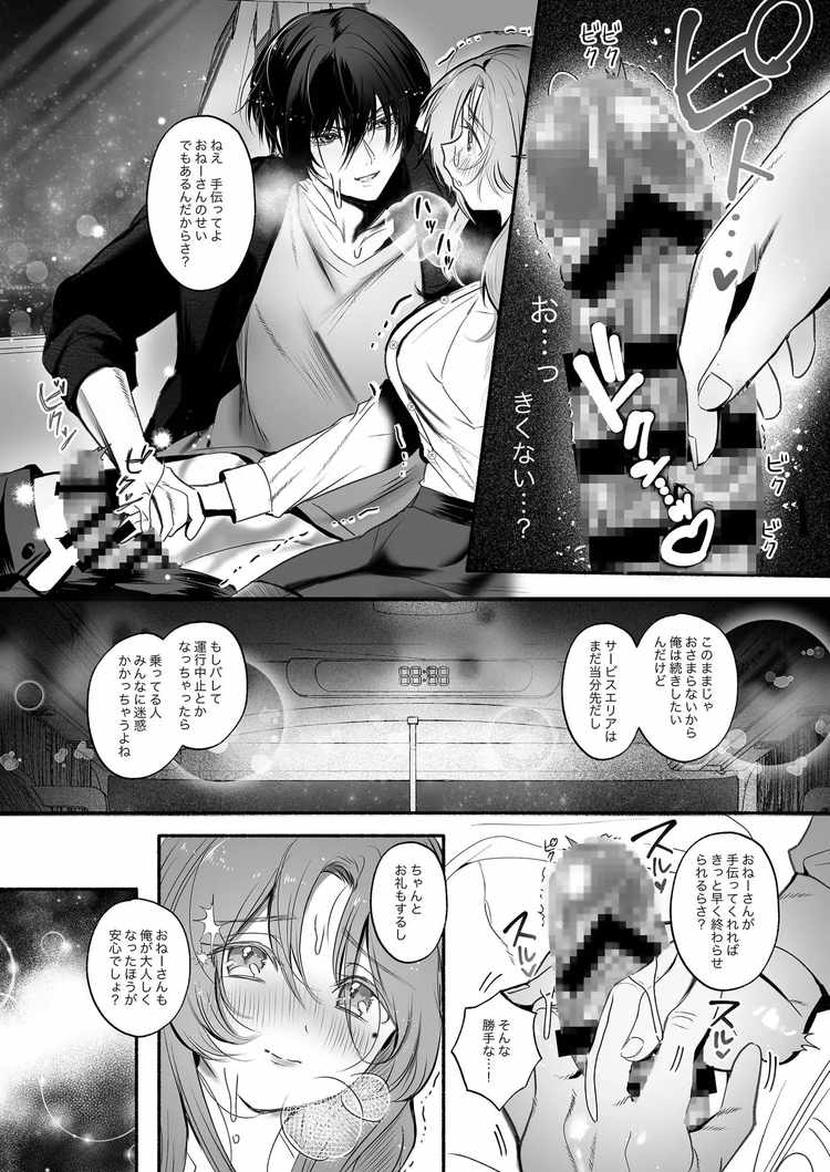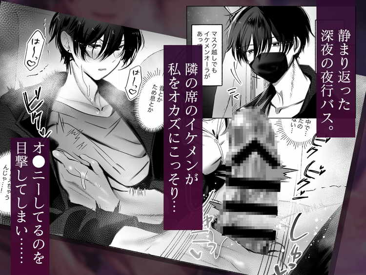 帰省するために夜行バスに乗った女性が、車内で出会った人気イケメンモデルと声を我慢しながら内緒でエッチするTL漫画です。そう聞くと運命的な出会いと思うかもしれませんが、このイケメン・リョウがとんでもない変態なのです。彼は目的もなく夜行バスに乗り込み、その道中にオナニーで射精しまくる変態オナニスト。そして今回、標的となったのが主人公の女性。眠りから目覚め、隣にいたリョウと目が合ったかと思えば彼はオナニーの真っ最中。自分をおかずにしてシコシコしていることが判明。この時点で大声を上げてしまいそうになりますが、リョウのイケメンパワーと脅迫によって耐えることを選択してしまう。「手伝ってよ」という彼のお願いを拒めず、キスと手コキで射精に追い込まされて口内射精で精液を受け止める。さらにスイッチが入ってしまった二人は夜行バスの中での性行為がエスカレートし、狭い車内で声を押し殺しながらセックスまでしてしまうストーリー。恐るべき変態イケメンのオナニーと攻めをお楽しみください。