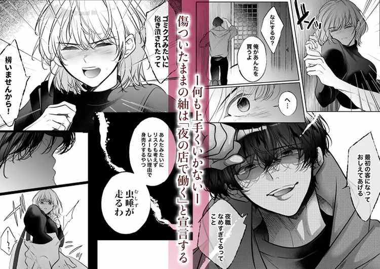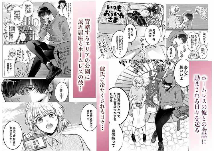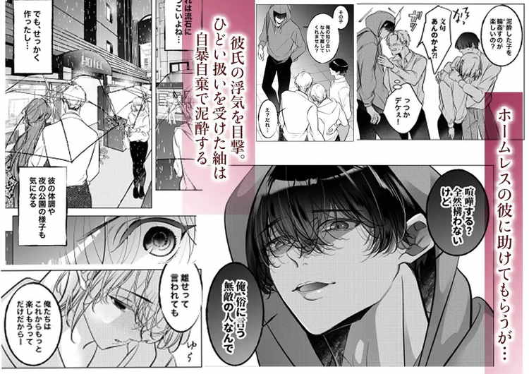生活保護員として働く主人公の紬は、彼氏のために弁当を作り、夜はご飯を作って待つが、食べてくれないどころか罵倒され続けるだけの日々を送っていた。ある日、巡回中に顔馴染みになったクールなイケメンホームレスに自分が彼氏のために作った弁当を差し出したところ完食&べた褒めされて励まされる。そんな彼の優しさに慰められた日の夜、浮気中の彼氏に遭遇。そこで、逆に罵倒されて失恋してしまった紬。クソすぎる彼氏です。自暴自棄になって飲み歩き泥酔していた紬を連れ去ろうとした男たちを止めたのはあのホームレスでした。そこから二人の距離は一気に縮まるが、風俗でとことん堕ちることを決意した紬にホームレスの青年はブチギレ。「最初の客になって教えてあげる」今まで無欲だった青年が雄になって牙をむく。彼氏よりも熱のこもった濃厚な前戯で体は快楽を求め、ガチガチの巨根で刺激的すぎるセックスを知る紬。ホームレスと生活保護員、互いに傷を持った男女が激しく淫らに慰め合うTL漫画です。トイレでのお漏らし絶頂シーンがめちゃエロです。