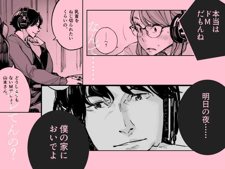 目つきがきつくて声も高くないせいで周りからSだと思われている主人公・山本さん。実は、顔がパンパンになるまで叩かれたいし、意識が飛ぶまでレバーブローをされたいほど超弩級の変態ドM。それを見抜いたのが、日課でネトゲをしながら下ネタトークができる関係の職場の上司・松村さん。こういう関係いいですね。そして「明日の夜、僕の家においでよ」ということで松村さんの家を訪れることに。いつもどおり何を考えているのかわからない松村さんの話術と空気感に乗せられて、どんどん性癖を露にしてゆく。それとともに超弩級のドSを露にしてゆく松村さんにオナニーを指示され、あそこを濡らして恥ずかしい姿をさらけ出してしまう山本さん。乳首を弄られ、イラマチオを強要され、スパンキングを交えたSMセックスで性癖を剥き出しにして絡み合う。SとMの性癖を持った上司と部下のTL漫画です。理想のセックスを提供してくれる相手が職場にいてよかったです。恥辱や痛みを伴うプレイを求めるドM女性におすすめ。