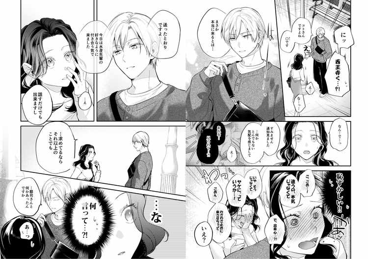 セックスは乱暴で自己中、おまけに浮気性な彼氏と喧嘩した勢いで破局を迎えた主人公・水澄琴乃は、ヤケになって作った裏垢で「めちゃくちゃにしてくれる人」を募集。そこに応募して会いに来たのは「王子」というあだ名がピッタリなほど、容姿も中身も素敵な後輩・西王寺大河。彼の優しい眼差しと心の籠ったセリフによって流れるように肉体関係を持つことに。彼氏とは違う優しい前戯、相手を思いやるようなセックス。そして、少し意地悪な言葉責めと愛情を注ぎ込むような絶頂。会社では完璧な後輩に、あそこをクンニされ、エッチなセリフで攻められるドキドキ感がたまりません。すでにクズ彼氏と別れたことを知らずに攻めてくる後輩・西王寺くんが可愛すぎる。素敵な後輩に甘やかされて堕とされるオフィスラブTL漫画です。
